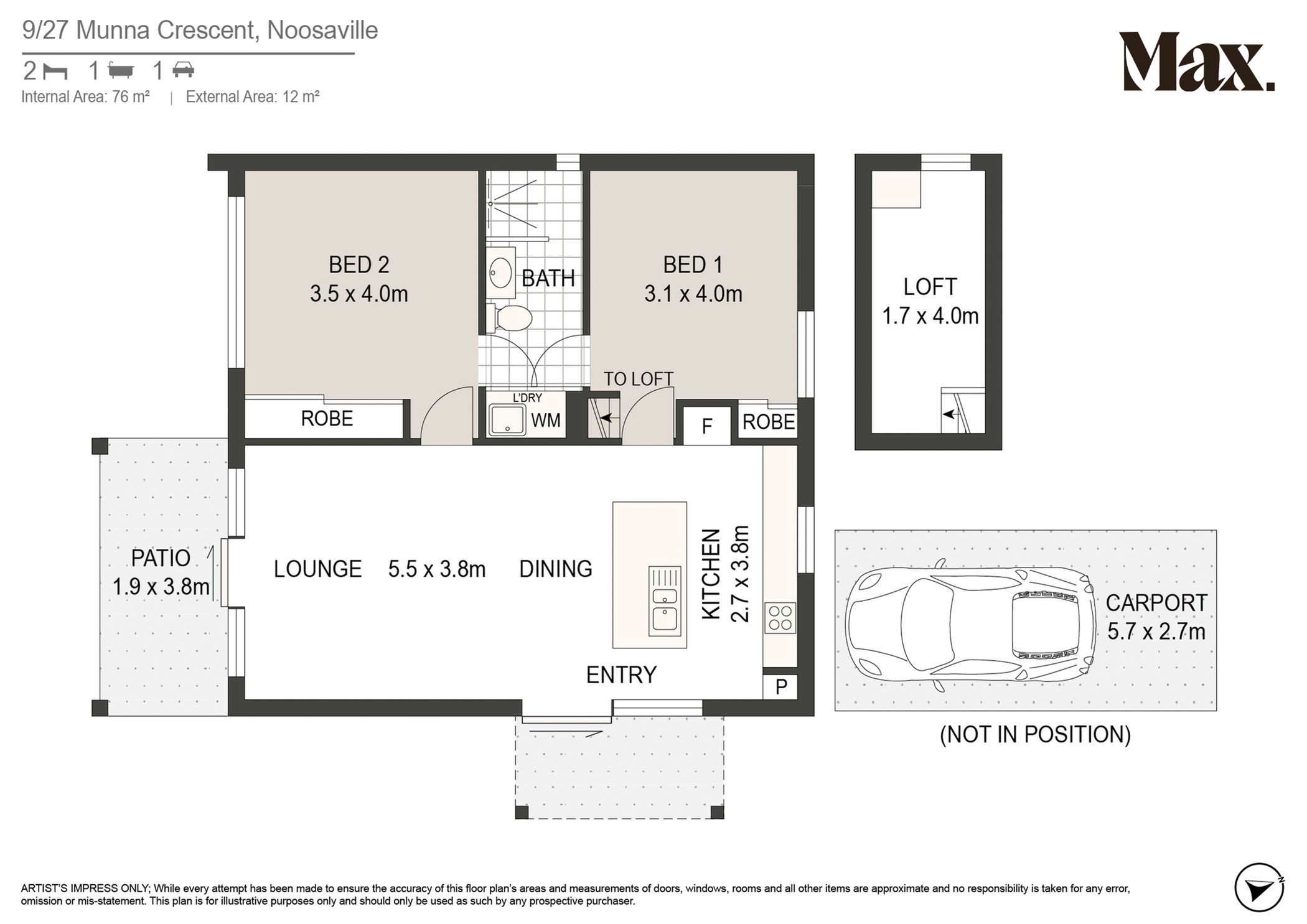 - Two bedrooms, one bathroom, with allocated adjoining carport